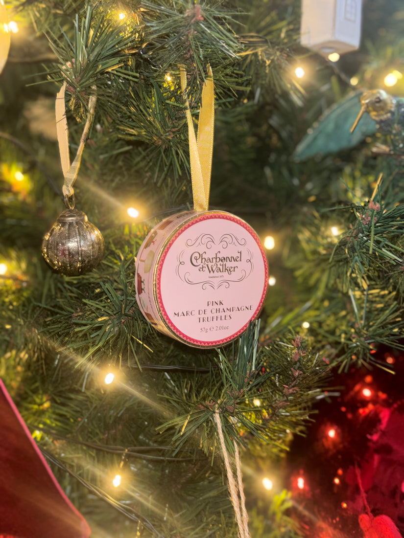 This delightful bauble is filled with five iconic Pink Marc de Champagne Truffles. Luxurious white chocolate truffles with a hint of strawberry and a creamy Marc de Champagne centre. Housed in a beautiful bauble gift box in pink, gold and red, the sides illustrated with train carriage decorations. A journey from Paris to London as we celebrate 150 years of chocolate making history. Perfect for the Christmas tree, table decorations and all important stocking fillers.