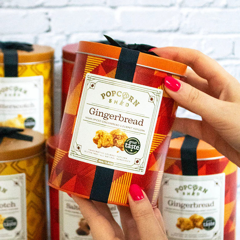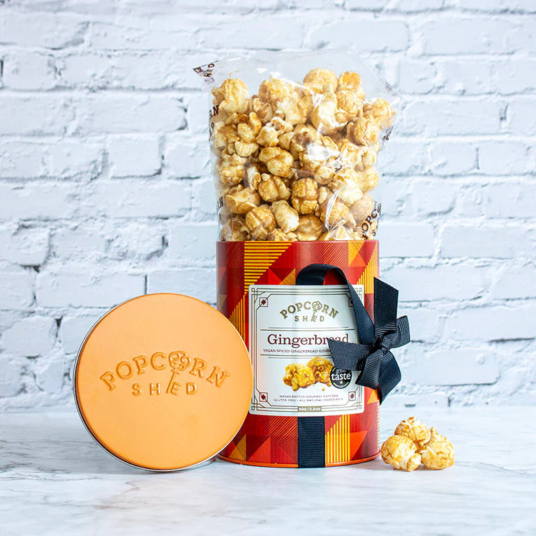 GINGERBREAD POPCORN GIFT TIN - 80g Tin Looking for the perfect gift to sit pretty under the Christmas tree or in their stocking? Our beautifully packaged tin is filled to the brim with our favourite festive flavour - Gingerbread! Each bite will take you to a gingerbread house (or should we say, shed) of your dreams. Inside, you’ll find a pop-tastic treasure: caramel popcorn infused with a delightfully festive medley of ginger and warming spices. With undertones of freshly baked gingerbread and a sprinkle of Christmas magic, it’s a cracker of a treat that’s sure to sleigh this season! REUSABLE – Once you’ve eaten all of your delicious popcorn treats, you can re-use the tin as a decorative piece in your home or a handy storage tin for everything from biscuits to socks. What’s not to like about that!
